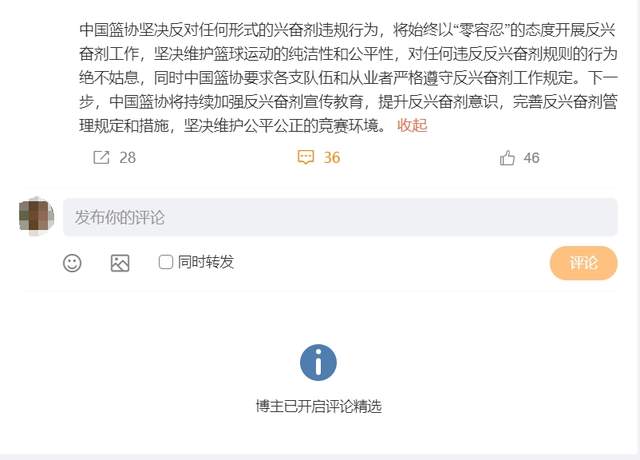 广东和新疆男篮发布的公告要点基本大差不差策略操盘,那就是联系当事球员配合调查,表态对兴奋剂零容忍的态度。评论区球迷们尽管也有一些不和谐声音,但大多还是敦促球队好好选外援,毕竟兴奋剂不是什么光彩的事情。而篮协的评论区却是半关闭状态,虽然也有30+的评论,但由于开启了评论精选,一条评论都没有对外展示。更引人深思的是,这件事本该是篮协公布调查结果,结果是事发两个月后由中国反兴奋剂中心官宣。兴奋剂怎么来的?谁让他们继续参赛的?是有什么难言之隐吗?这些球迷都没有得到答案。