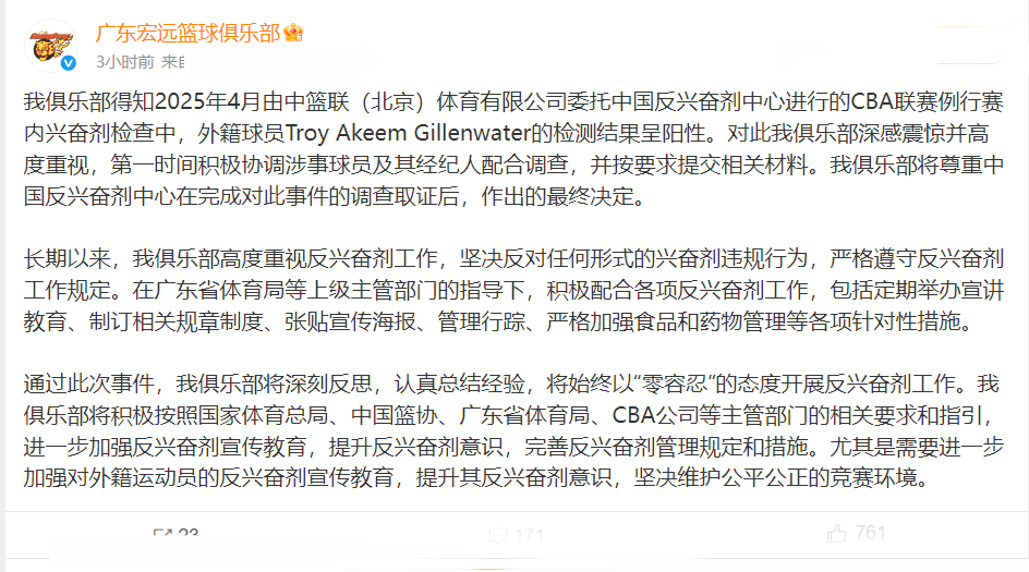尽管俱乐部在反兴奋剂工作上已经付出诸多努力,但此次吉伦沃特的违规事件仍给俱乐部敲响了警钟。俱乐部表示将深刻反思,认真总结经验。未来,会始终以 “零容忍” 的坚定态度开展反兴奋剂工作,积极按照国家体育总局、中国篮协、广东省体育局、CBA 公司等主管部门的相关要求和指引,进一步加强反兴奋剂宣传教育工作。