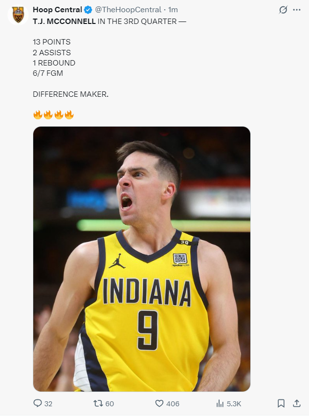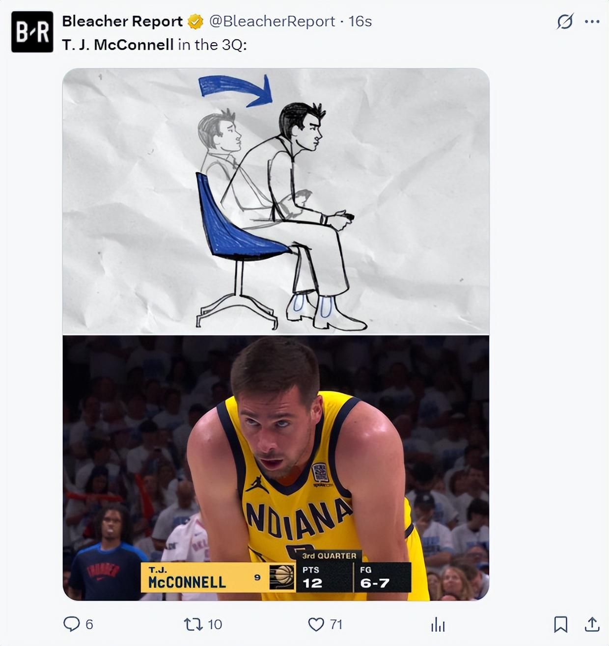 哈利伯顿上半场5中0+三分6中0,麦克康奈尔在第三节进入了Zone的状态,他露出了“死亡之瞳”,因为他知道步行者的进攻再不提升这场比赛就要交待了,麦康扛着、、SGA等人不断突破得分。
