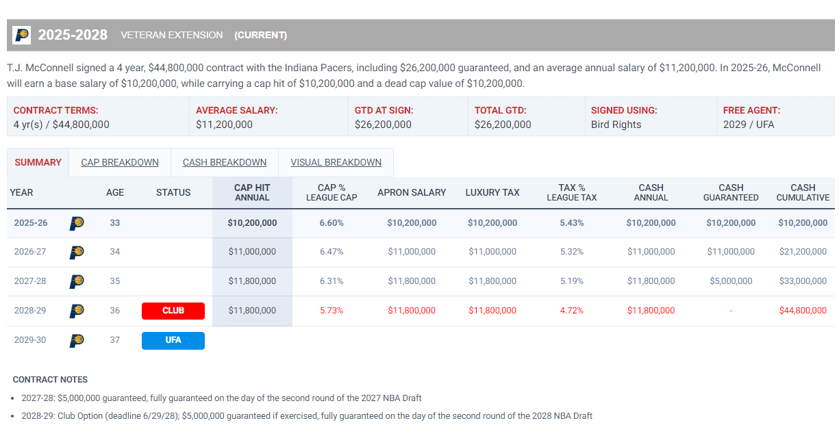 步行者与麦康达成了四年4480万的续约,他下赛季的薪水为1020万,28-29赛季是球队选项。这份合同真的是超值合同。